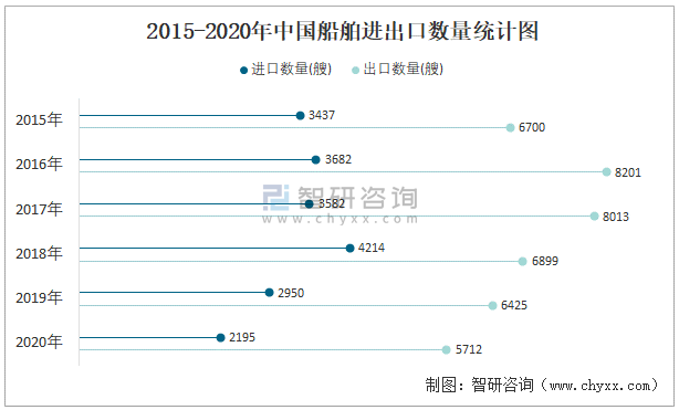 2015-2020年中國船舶進(jìn)出口數(shù)量統(tǒng)計圖
