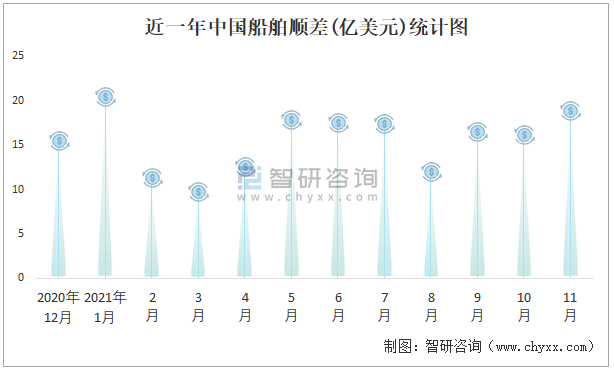 近一年中國船舶順差(億美元)統(tǒng)計圖