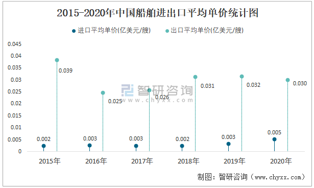 2015-2020年中國船舶進(jìn)出口平均單價統(tǒng)計圖