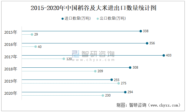2015-2020年中國稻谷及大米進(jìn)出口數(shù)量統(tǒng)計(jì)圖
