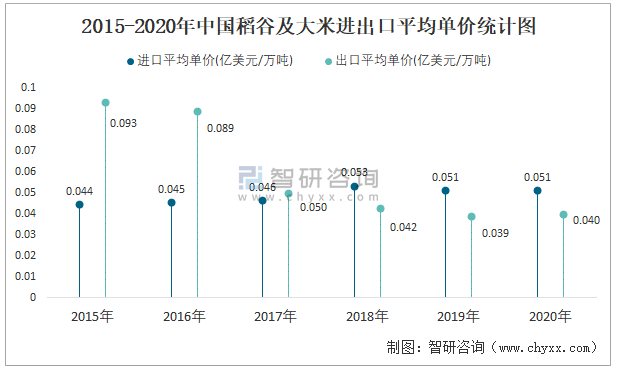 2015-2020年中國稻谷及大米進(jìn)出口平均單價(jià)統(tǒng)計(jì)圖