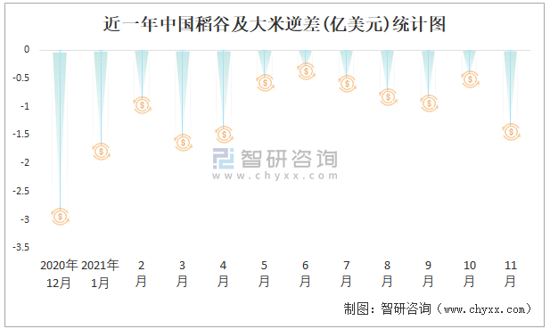 近一年中國稻谷及大米逆差(億美元)統(tǒng)計(jì)圖