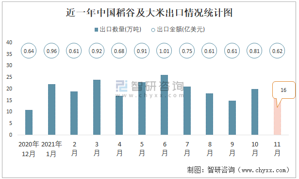 近一年中國稻谷及大米出口情況統(tǒng)計(jì)圖