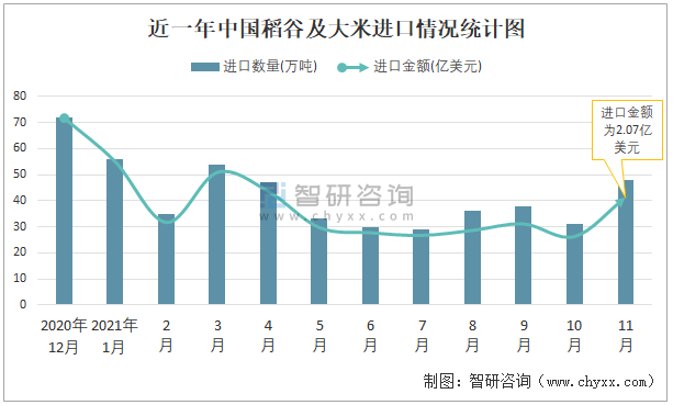 近一年中國稻谷及大米進(jìn)口情況統(tǒng)計(jì)圖