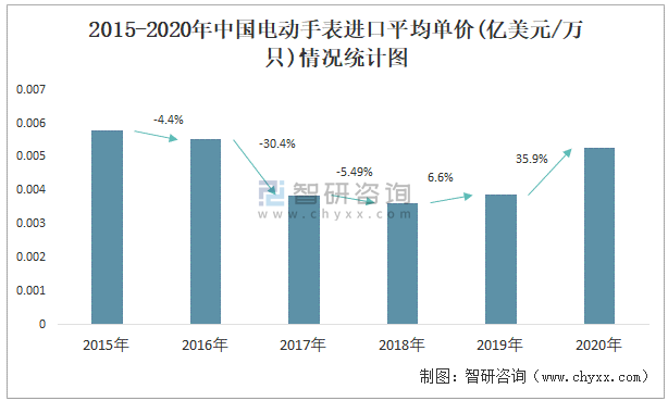 2015-2020年中國(guó)電動(dòng)手表進(jìn)口平均單價(jià)(億美元/萬只)情況統(tǒng)計(jì)圖