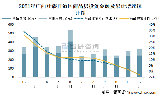 2021年廣西壯族自治區商品房投資金額及累計增速統計圖
