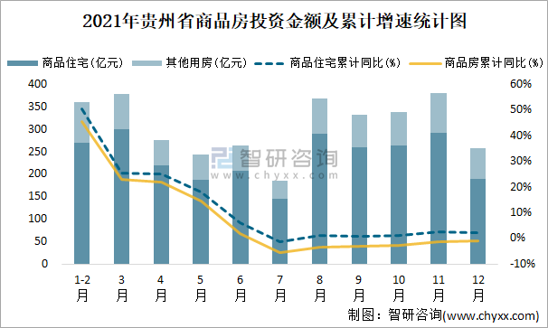 2021年貴州省商品房投資金額及累計增速統計圖