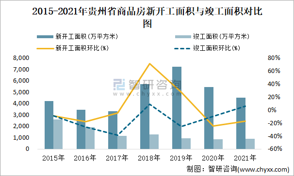 2015-2021年貴州省商品房新開工面積與竣工面積對比圖