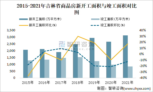 2015-2021年吉林省商品房新開工面積與竣工面積對比圖
