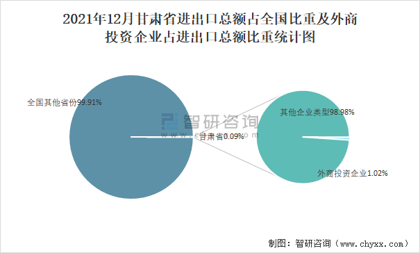 2021年12月甘肅省進出口總額占全國比重及外商投資企業(yè)占進出口總額比重統(tǒng)計圖