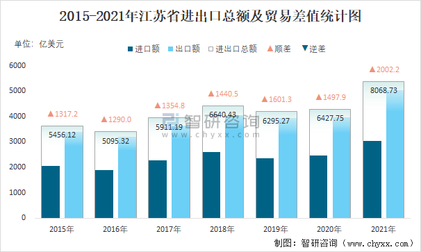 2015-2021年江蘇省進出口總額及貿易差值統計圖
