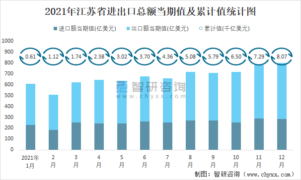 2021年1-12月江蘇省進出口總額為8.07千億美元,累計同比增長25.5%