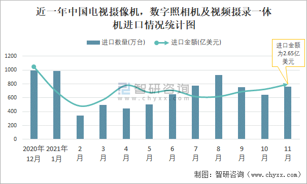 根據中國海關數據顯示:2021年11月中國電視攝像機,數字照相機及視頻攝錄一體機進口數量為761萬臺,同比下降8.6%,進口金額為2.65億美元,同比增長12.3%,2021年11月中國電視攝像機,數字照相機及視頻攝錄一體機出口數量為5623萬臺,同比增長2.2%,出口金額為14.25億美元,同比增長14.8%;2021年1-11月中國電視攝像機,數字照相機及視頻攝錄一體機進口數量為7271萬臺,進口金額為24.41億美元,出口數量為53135萬臺,出口金額為119.63億美元。
