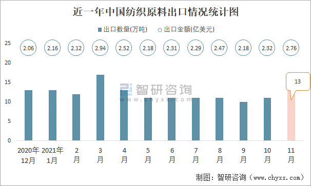 近一年中國紡織原料出口情況統計圖