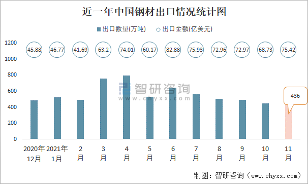 近一年中國鋼材出口情況統(tǒng)計圖