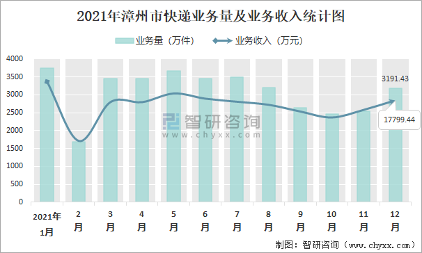 2021年12月漳州市快遞業務量與業務收入分別為3191.43萬件和17799.44萬元