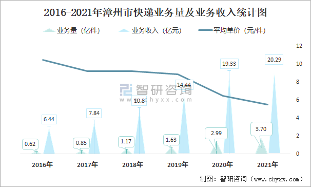 2016-2021年漳州市快遞業務量及業務收入統計圖