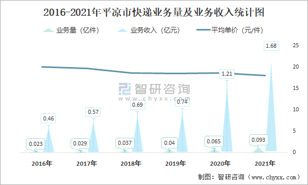 根據(jù)各省市郵政局?jǐn)?shù)據(jù)可知:2021年12月平?jīng)鍪锌爝f業(yè)務(wù)量為102.14萬件,業(yè)務(wù)收入為1587.35萬元;2021年1-12月平?jīng)鍪锌爝f累計(jì)業(yè)務(wù)量為925.91萬件,同比增長(zhǎng)41.46%,累計(jì)業(yè)務(wù)收入為16847.29萬元,同比增長(zhǎng)39.25%;2016-2021年平?jīng)鍪锌爝f業(yè)務(wù)量與業(yè)務(wù)收入逐年遞增,平均單價(jià)總體呈現(xiàn)下降趨勢(shì)。