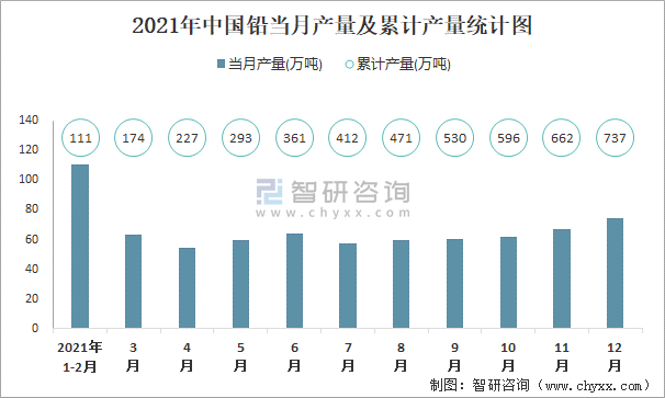 根據(jù)國家統(tǒng)計(jì)局?jǐn)?shù)據(jù)顯示:2021年12月中國鉛產(chǎn)量為74.1萬噸,同比增長3.9%;2021年1-12月中國鉛累計(jì)產(chǎn)量為736.5萬噸,累計(jì)增長11.2%;2016-2021年中國鉛產(chǎn)量呈現(xiàn)上升趨勢。
