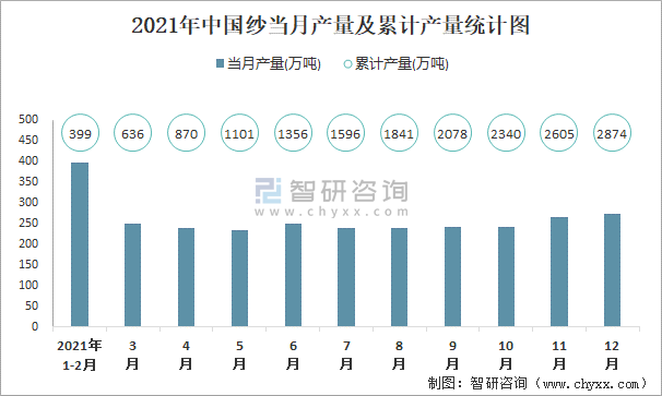 2021年中國紗當月產量及累計產量統計圖
