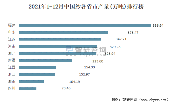 根據國家統計局數據顯示:2021年各季度中國紗主要集中在華東、華中、西北地區生產;2021年1-12月中國紗產量大區分布不均衡,其中華東地區產量最高,特別是福建省貢獻了最多產量;2021年1-12月中國紗各省市產量呈現梯隊式分布,福建、山東、江蘇等省產量最多。