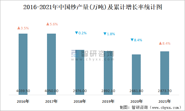 2016-2021年中國紗產量及累計增長率統計圖