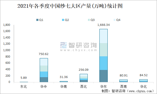 2021年各季度中國紗七大區產量統計圖