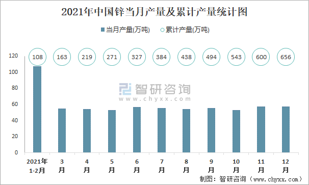 2021年中國鋅當月產量及累計產量統計圖