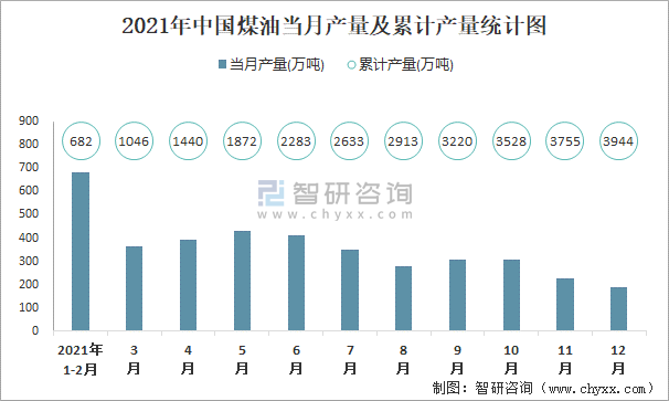 2021年中國煤油當(dāng)月產(chǎn)量及累計(jì)產(chǎn)量統(tǒng)計(jì)圖