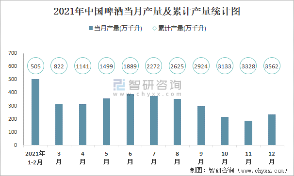 2021年中國啤酒當月產量及累計產量統計圖