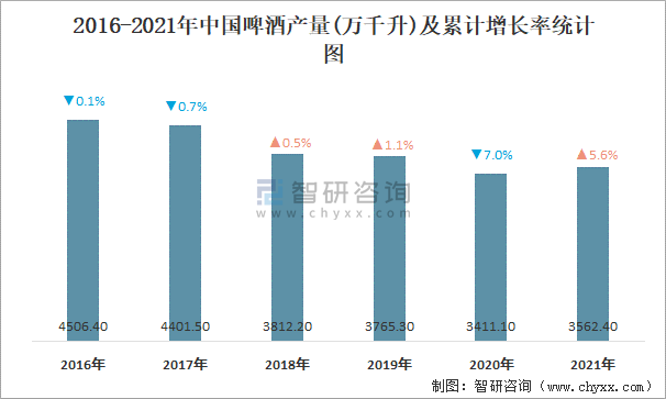 根據國家統計局數據顯示:2021年12月中國啤酒產量為236萬千升,同比增長10.9%;2021年1-12月中國啤酒累計產量為3562.4萬千升,累計增長5.6%;2016-2021年中國啤酒產量總體呈現下降趨勢。