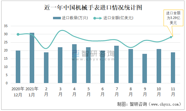 根據中國海關數據顯示:2021年11月中國機械手表進口數量為19萬只,同比下降45.7%,進口金額為3.29億美元,同比下降8.6%,2021年1-11月中國機械手表進口數量為239萬只,進口金額為33.44億美元。