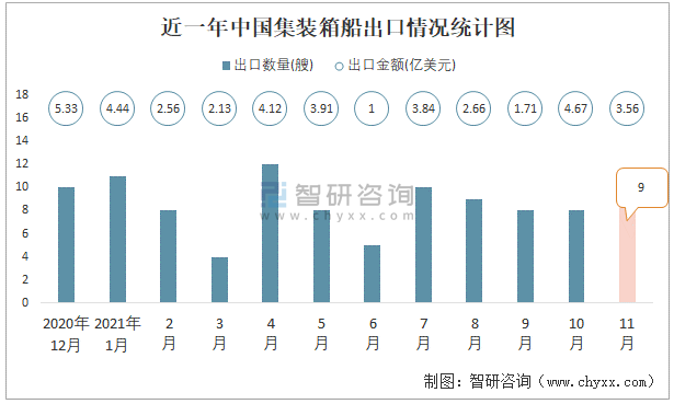 根據中國海關數據顯示:2021年11月中國集裝箱船出口數量為9艘,同比增長125%,出口金額為3.56億美元,同比增長243.2%;2021年1-11月中國集裝箱船出口數量為92艘,出口金額為34.61億美元。