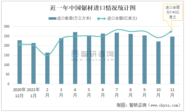 根據中國海關數據顯示:2021年11月中國鋸材進口數量為248萬立方米,同比增長1.7%,進口金額為7.41億美元,同比增長29.5%,2021年1-11月中國鋸材進口數量為2662萬立方米,進口金額為71.79億美元。