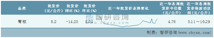根據農村農業部數據統計可知:2022年第5周全國青椒平均批發價為8.2元/公斤,同比下跌14.23%,環比增加8.04%,近一年全國青椒平均批發價最高達到10.29元/公斤,批發價最低也要3.11元/公斤。