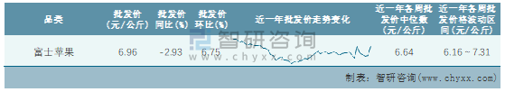 根據(jù)農(nóng)村農(nóng)業(yè)部數(shù)據(jù)統(tǒng)計(jì)可知:2022年第5周全國(guó)富士蘋果平均批發(fā)價(jià)為6.96元/公斤,同比下跌2.93%,環(huán)比增加6.75%,近一年全國(guó)富士蘋果平均批發(fā)價(jià)最高達(dá)到7.31元/公斤,批發(fā)價(jià)最低也要6.16元/公斤。