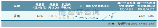 根據(jù)農(nóng)村農(nóng)業(yè)部數(shù)據(jù)統(tǒng)計可知:2022年第5周全國香蕉平均批發(fā)價為6.36元/公斤,同比增加30.86%,環(huán)比增加2.25%,近一年全國香蕉平均批發(fā)價最高達(dá)到6.36元/公斤,批發(fā)價最低也要4.59元/公斤。