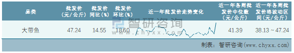 根據(jù)農(nóng)村農(nóng)業(yè)部數(shù)據(jù)統(tǒng)計(jì)可知:2022年第5周全國(guó)大帶魚平均批發(fā)價(jià)為47.24元/公斤,同比增加14.55%,環(huán)比增加18.6%,近一年全國(guó)大帶魚平均批發(fā)價(jià)最高達(dá)到47.24元/公斤,批發(fā)價(jià)最低也要38.13元/公斤。