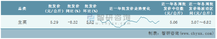 根據農村農業部數據統計可知:2022年第6周全國生菜平均批發價為5.29元/公斤,同比下跌8.32%,環比增加3.52%,近一年全國生菜平均批發價最高達到6.82元/公斤,批發價最低也要3.07元/公斤。