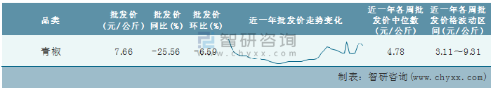 根據(jù)農(nóng)村農(nóng)業(yè)部數(shù)據(jù)統(tǒng)計(jì)可知:2022年第6周全國(guó)青椒平均批發(fā)價(jià)為7.66元/公斤,同比下跌25.56%,環(huán)比下跌6.59%,近一年全國(guó)青椒平均批發(fā)價(jià)最高達(dá)到9.31元/公斤,批發(fā)價(jià)最低也要3.11元/公斤。
