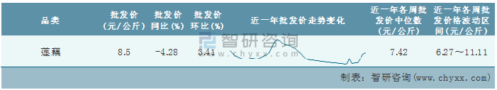 根據(jù)農(nóng)村農(nóng)業(yè)部數(shù)據(jù)統(tǒng)計(jì)可知:2022年第6周全國蓮藕平均批發(fā)價(jià)為8.5元/公斤,同比下跌4.28%,環(huán)比增加3.41%,近一年全國蓮藕平均批發(fā)價(jià)最高達(dá)到11.11元/公斤,批發(fā)價(jià)最低也要6.27元/公斤。