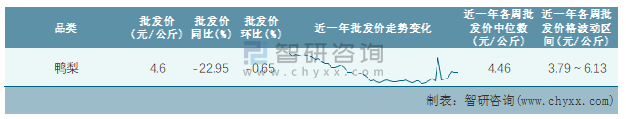 根據農村農業部數據統計可知:2022年第6周全國鴨梨平均批發價為4.6元/公斤,同比下跌22.95%,環比下跌0.65%,近一年全國鴨梨平均批發價最高達到6.13元/公斤,批發價最低也要3.79元/公斤。