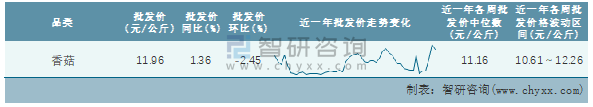 根據(jù)農(nóng)村農(nóng)業(yè)部數(shù)據(jù)統(tǒng)計可知:2022年第6周全國香菇平均批發(fā)價為11.96元/公斤,同比增加1.36%,環(huán)比下跌2.45%,近一年全國香菇平均批發(fā)價最高達(dá)到12.26元/公斤,批發(fā)價最低也要10.61元/公斤。