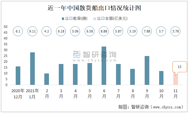 根據中國海關數據顯示:2021年11月中國散貨船出口數量為13艘,同比下降35%,出口金額為3.78億美元,同比下降34.2%;2021年1-11月中國散貨船出口數量為208艘,出口金額為64.43億美元。