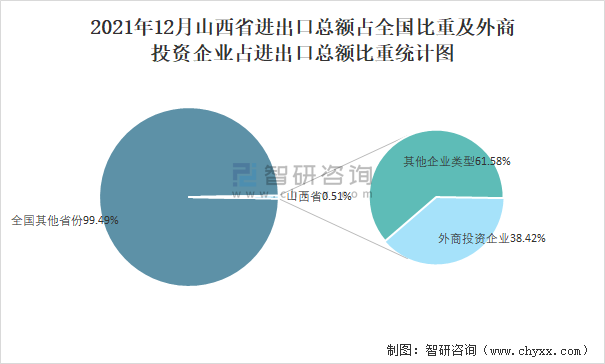2021年12月山西省進出口總額占全國比重及外商投資企業占進出口總額比重統計圖