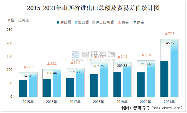 2015-2021年山西省進出口總額及貿易差值統計圖
