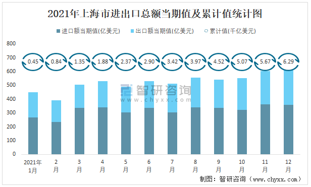 2021年12月上海市進出口總額為611.55億美元,其中進口額為360.1億美元,出口額為251.45億美元;2021年1-12月進出口總額為6.29千億美元,進出口總額(以美元計價)累計同比增長24.8%,其中累計進口額占比61.29%,累計出口額占比38.71%。2015-2021年上海市進出口總額在2016年跌至最低值,此后總體呈現上升趨勢;2015-2021年上海市進出口貿易差值總體呈現貿易逆差狀態。