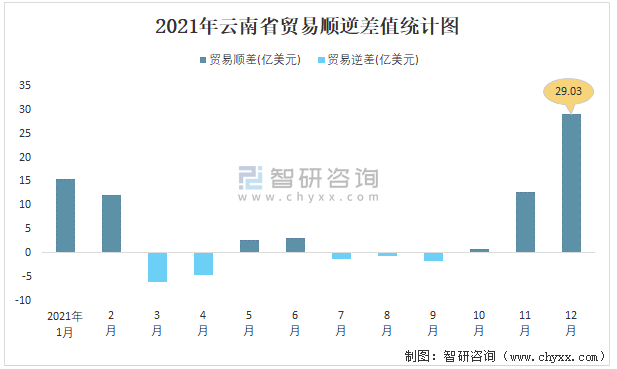 2021年云南省貿易順逆差值統計圖