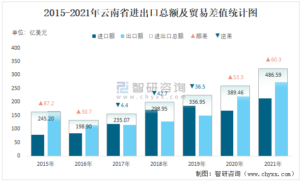 2015-2021年云南省進出口總額及貿易差值統計圖
