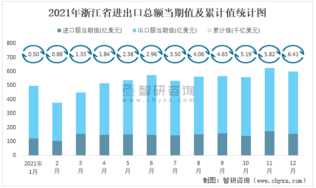 2021年1-12月浙江省進出口總額為6.41千億美元,累計同比增長31.2%